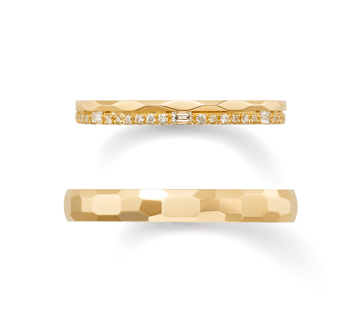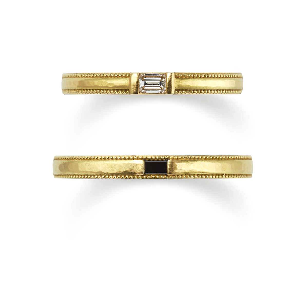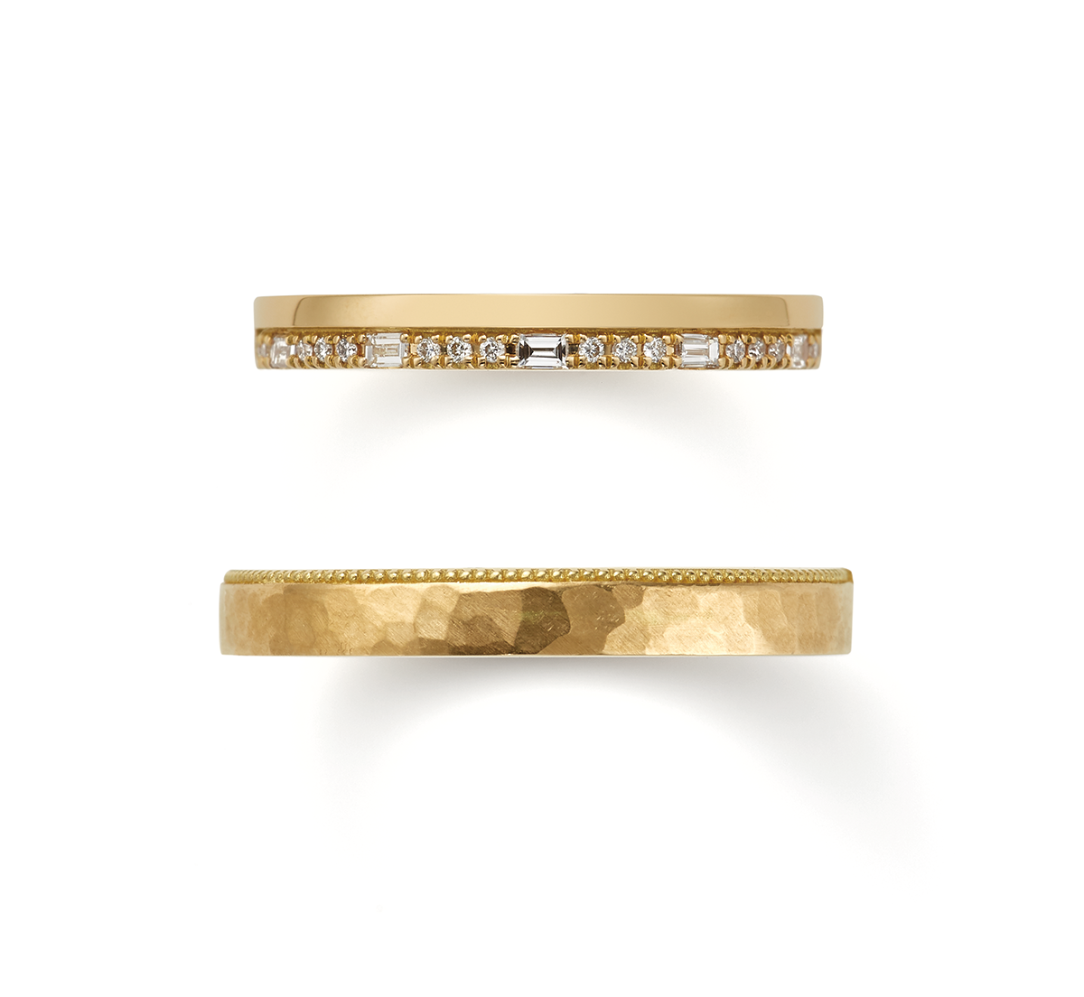 カットハンマーで加工されたアームが存在感を発揮する結婚指輪です。上の指輪にはエメラルドカットのダイヤモンドをセッティングしていて、上品さがプラスされています。