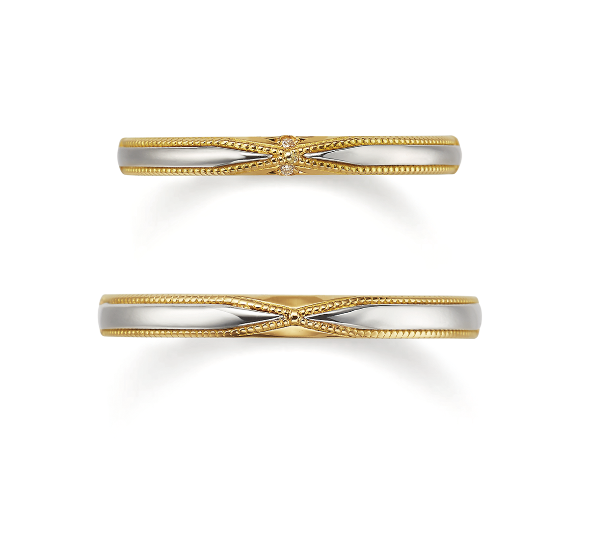 プラチナとゴールドのコンビ素材の個性溢れる結婚指輪です。ゴールド部分にはミル打ちが施されていて、アンティーク調のデザインが特徴的。センターが絞られているデザインは、指を美しく見せてくれます。