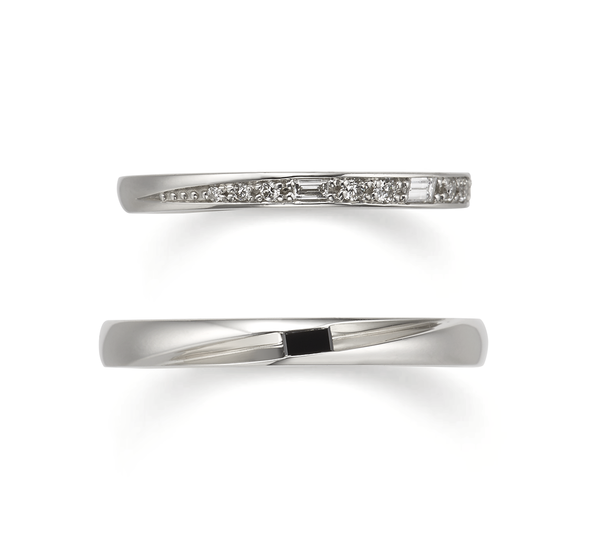 大人な雰囲気が漂う結婚指輪です。上の指輪はシンプルな指輪とエタニティリングを重ねたようなデザインが特徴的。異なるカットのダイヤモンドの輝きを味わえます♪