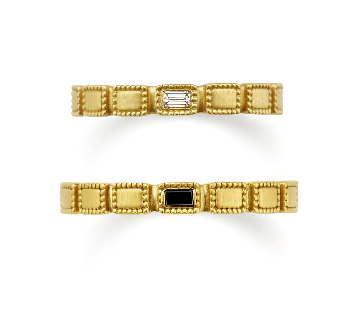 上の指輪にはバゲットカットダイヤモンド、下の指輪にはブラックダイヤモンドをセッティングしてアクセントをつけています。華やかさがありますがファッションリングのように身につけやすいのが魅了的ですよ♡