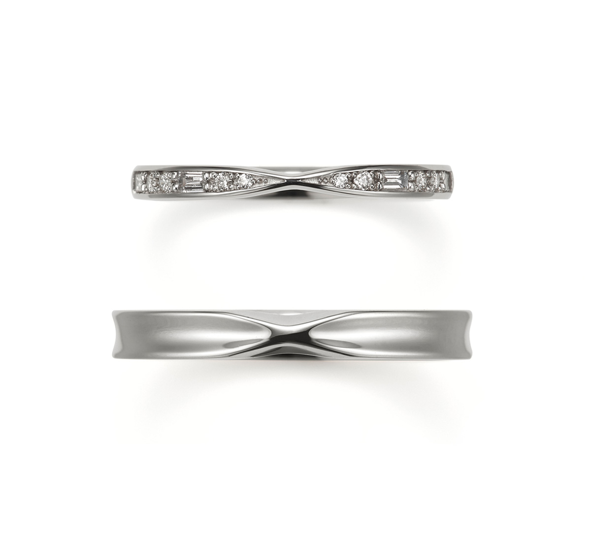 センターが絞られていてエレガントな印象の結婚指輪です。上の指輪のアームには形の異なるダイヤモンドをセッティングしていて華やかさがあります。