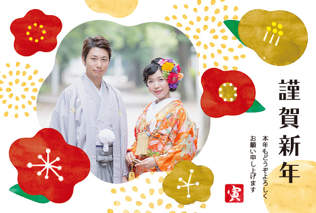 結婚した翌年の年賀状は、結婚式に出席してくれた方にも、結婚式や前撮りの写真などを使った年賀はがきを送るカップルが多いです♡