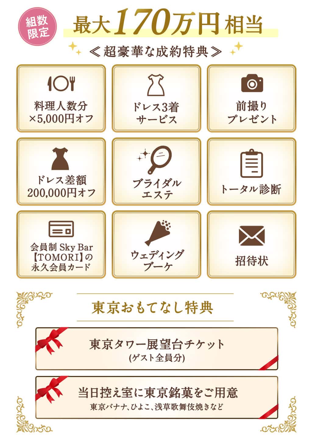 <大好評につき1月も開催>年間で最もお得な【メガBIGキャンペーン】!成約で最大170万円相当の特典には、料理人数分×5,000円オフに加え、花嫁の憧れを叶える「ウェディングドレストータル診断(顔タイプ・骨格・カラー)」もセットに。来館特典は豪華試食やAmazonギフト券など総額5.8万円分をプレゼント!14:00~の回なら幻想的なナイトチャペルも見学可能です。東京タワーの麓「The Place of Tokyo」で、新年のスタートにふさわしい、賢い結婚式準備を始めませんか?