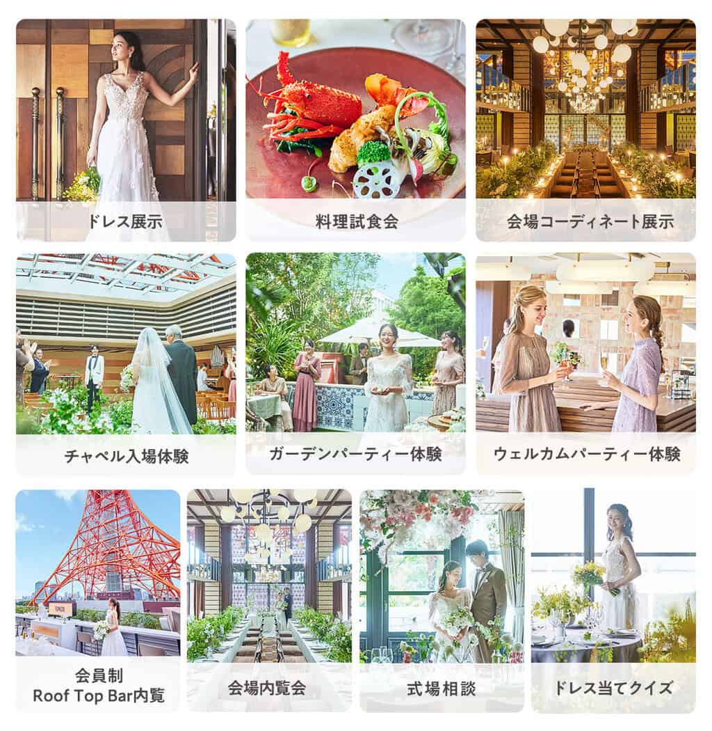 そのほか、ガーデンでのデザートビュッフェ体験や挙式前のウェルカムパーティー体験など、コンテンツ盛りだくさん!新郎新婦視点はもちろん、ゲスト目線でも結婚式を体験できます。