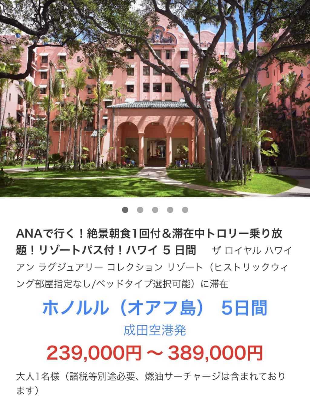 「太平洋のピンクパレス」と呼ばれ愛されているロイヤルハワイアンホテル。由緒あるホテルですが、朝食1回とトロリー乗り放題もついて5日間で239,000円~はかなりお手頃です♡