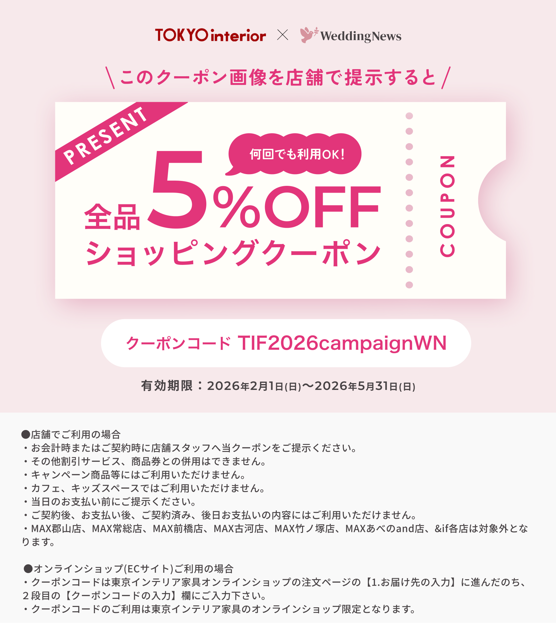 今回、ウェディングニュース限定で東京インテリアで利用できる5%OFFクーポンをご用意いただきました♡