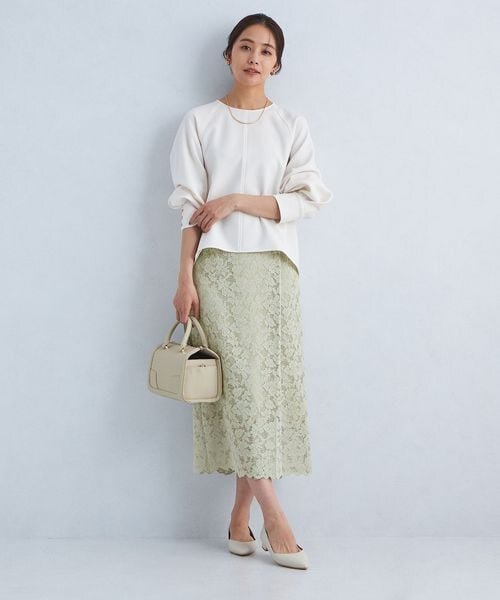パンツスタイルもトップスの色を柔らかくして優しい印象に。