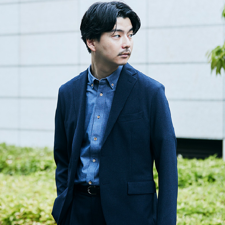 (デニムではなくスラックスなどオフィスカジュアルで使えるようなパンツを選んで*)