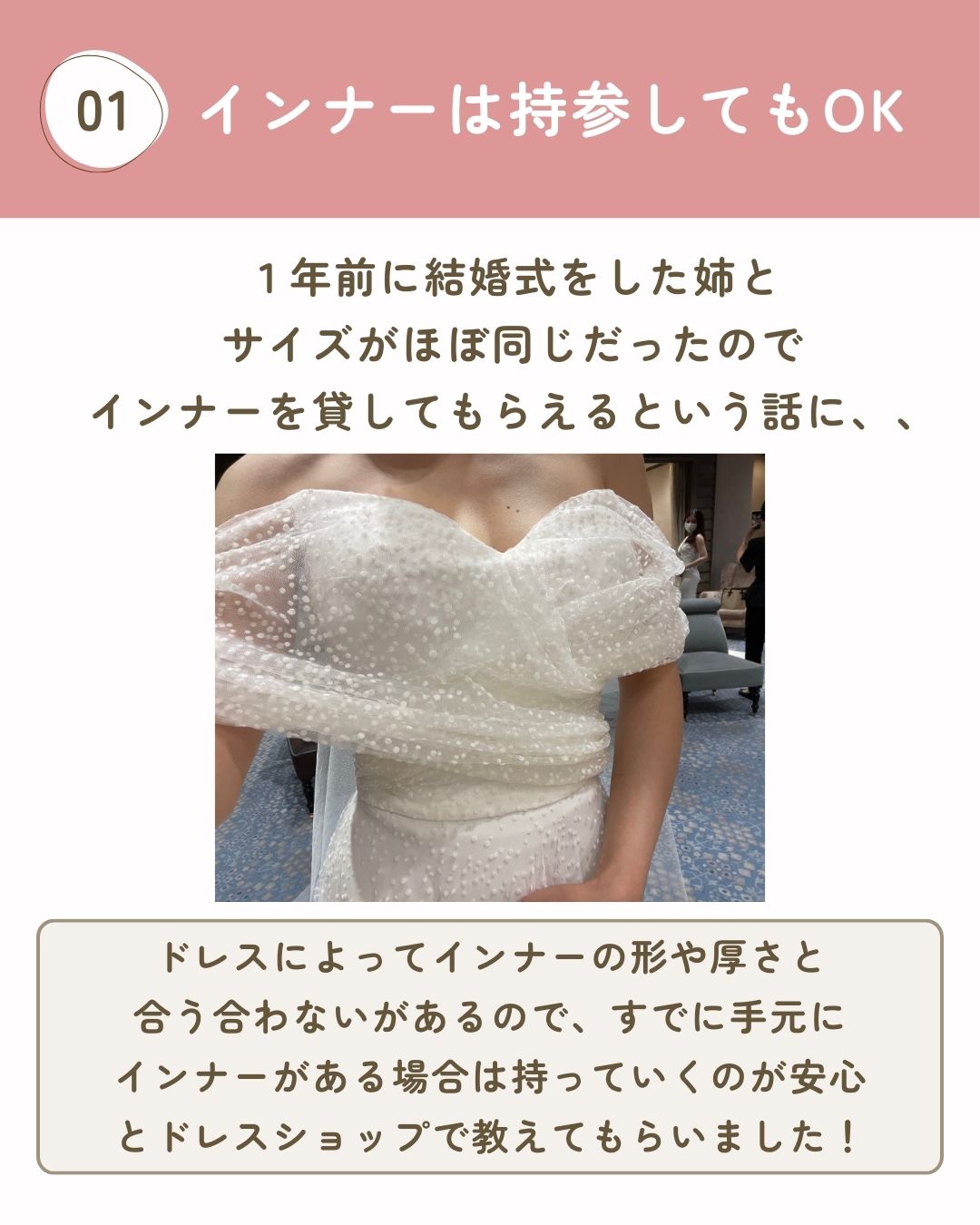意外と忘れがちなのが、ドレス試着の事前準備。持っていけばよかったものや、スタッフさんに聞いておけばよかったことなど、後悔しないために注意するポイントを教えてください!