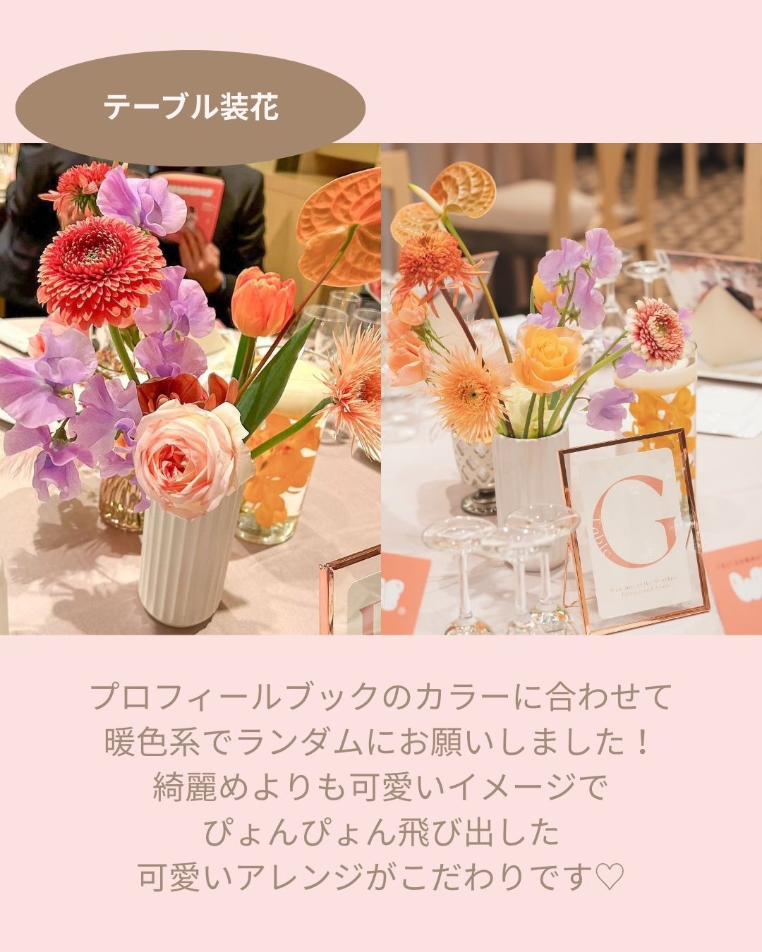 どんな雰囲気にしたか、装花はもちろんペーパーアイテムを含めた、トータルコーディネートを教えてください^^