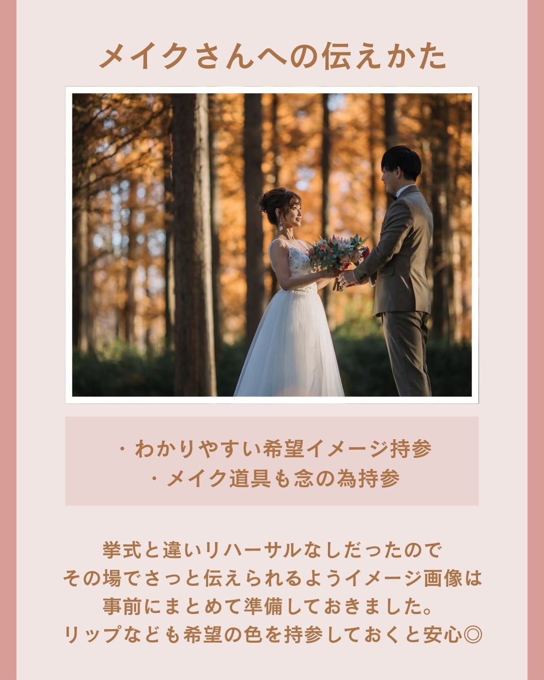 「このメイクで写真映えした」「担当のヘアメイクさんにこうお願いした」など、前撮りならではの工夫やお気に入りポイントも、写真と一緒にシェアしてください♡