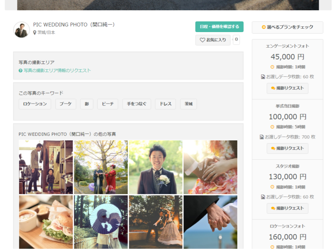 詳細ページには、その方が撮影した他の写真や、プラン・金額などが確認できます。