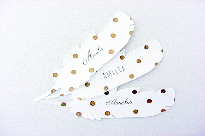 こちらは真っ白なフェザーとゴールドのドット柄の席札。