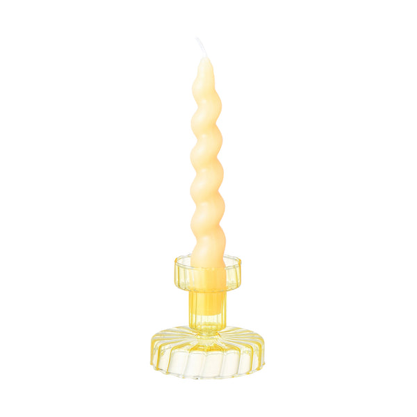 トレンド感あるねじり形状のパステルカラーのキャンドルと、繊細な手作りのガラススタンドが絶妙なバランス。
