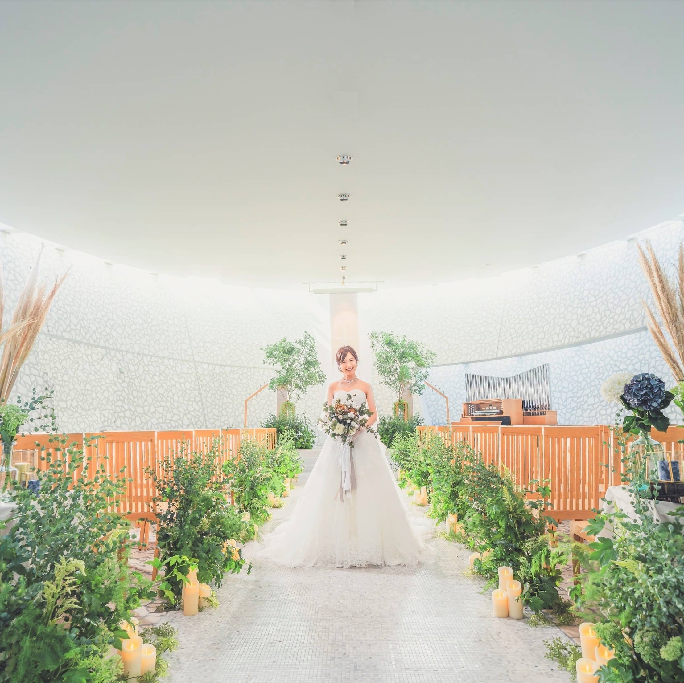 ガラス張りのバージンロードに花びらを敷き詰められたクラシカルなチャペルが大人かわいいと大人気!