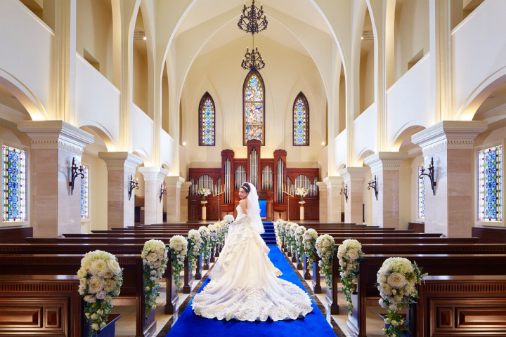 こちらのチャペルは森の中にシンボル的に建ち、大きなガラスの窓から豊かな緑と温かな陽光を感じられる仕立て。