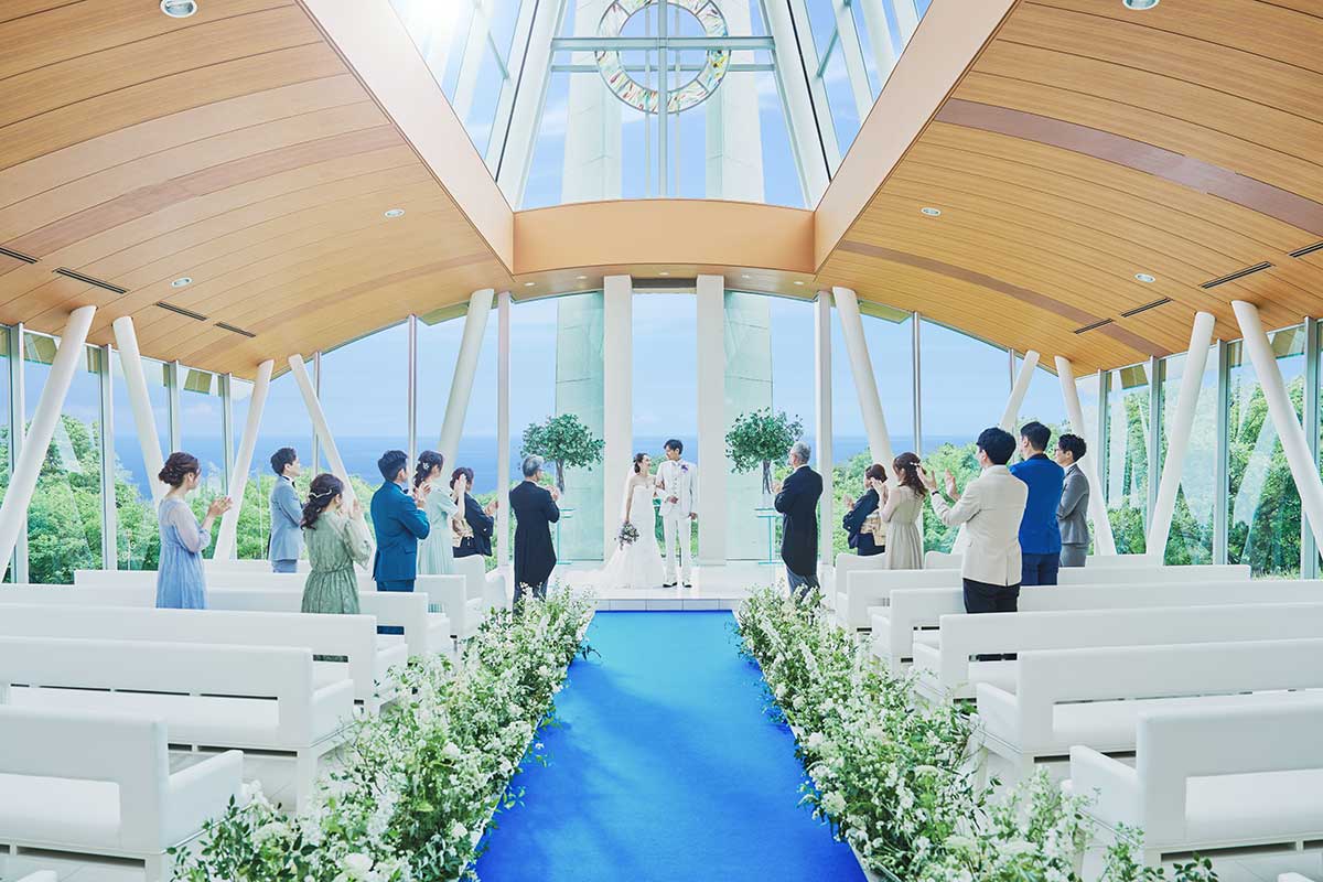 7万坪!の広大な敷地に建つリゾートホテル、ヒルトン小田原リゾート&スパ。ほぼ全面ガラス張りの独立型チャペルはどこまでも続く空と海に抱かれて、神聖な愛を誓える特別な空間。
