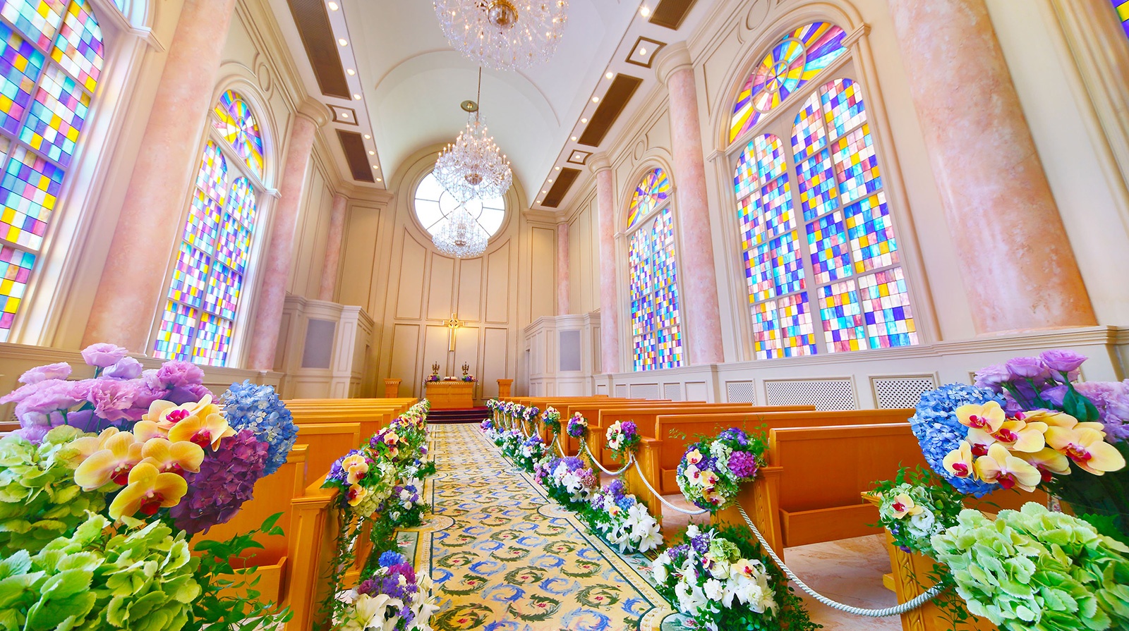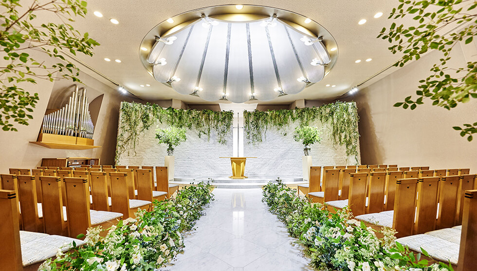 祭壇に伸びる15ⅿのバージンロードと天井高の高いチャペルが特徴的で豪華と回答者の皆さまからの声が多数。陽の光が注ぎ、白く輝くチャペルは花嫁さまの憧れですよね♡