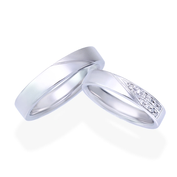 水平線から昇る太陽の光がイメージされている、緩やかなV字ラインの結婚指輪。プラチナ純度99%まで高めた4℃ピュアプラチナが使われています♡