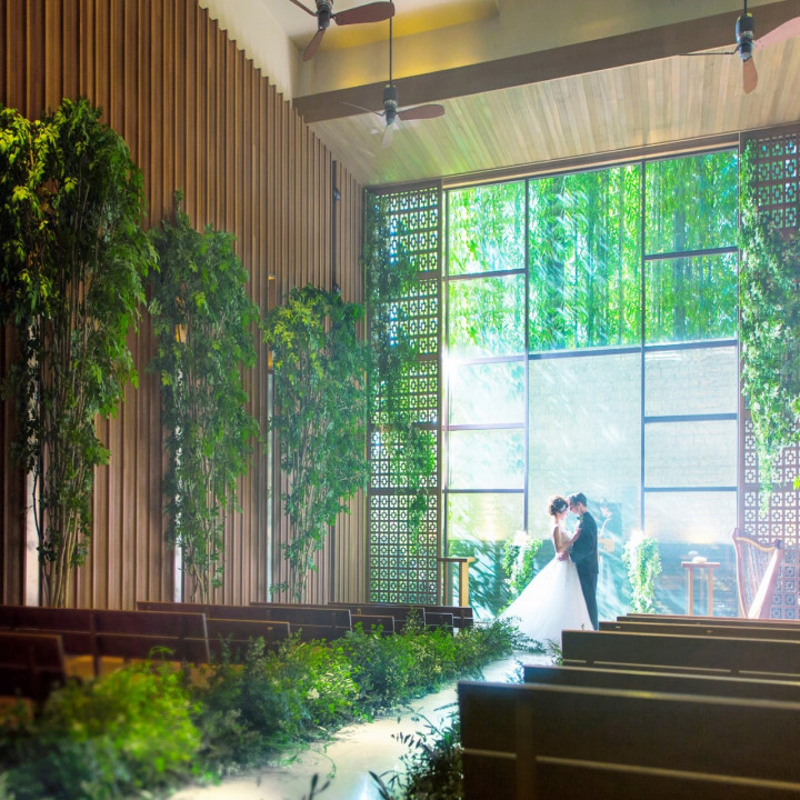 天神駅から徒歩1分で叶うガーデンウエディング♩豊かな緑に包まれたルーフトップチャペルがより上質なウェディングを演出します(^^)♡博多駅・空港からも近く、アクセス抜群なので遠方からのゲストも安心です。
