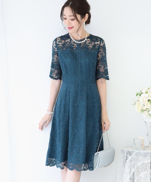 深いグリーンの総レースドレスは秋冬にぴったり*レースの透け感が女性らしさを演出してくれます。袖付きなので羽織りなしで着られるのも嬉しいですね◎